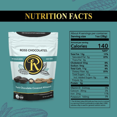 Dark Chocolate sweetened with Stevia (cocoa mass, cocoa butter, inulin, erythritol, natural vanilla extract, sunflower lecithin, steviol glycosides, whole milk powder), Almonds, Confectioner’s glaze