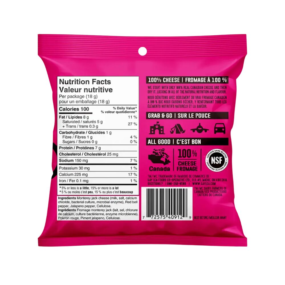 Nothing but Cheese– Monterey Jack is a delicious on-the-go crunchy snack made with 100% cheese. A single-serve 18 g bag gives you all the benefits you love: the nutrition of two cups of milk, high protein (7 g), gluten-free, low carbs and only 100 calories! It is also a perfect topper for soups and salads.
