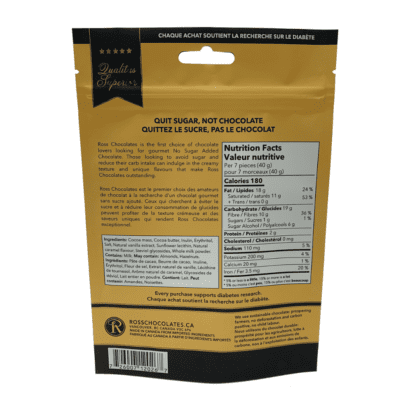 Made in small batches, this pouch is full of slim squares that taste both sweet and salty. Our rich, smooth, sugar-free dark chocolate is infused with caramel and seasoned with sea salt in small batches. The pop of the sea salt crystals embedded in smooth, rich, caramel-flavoured dark chocolate makes these minis the perfect after-dinner—or anytime—treat that won’t affect your blood sugar levels.