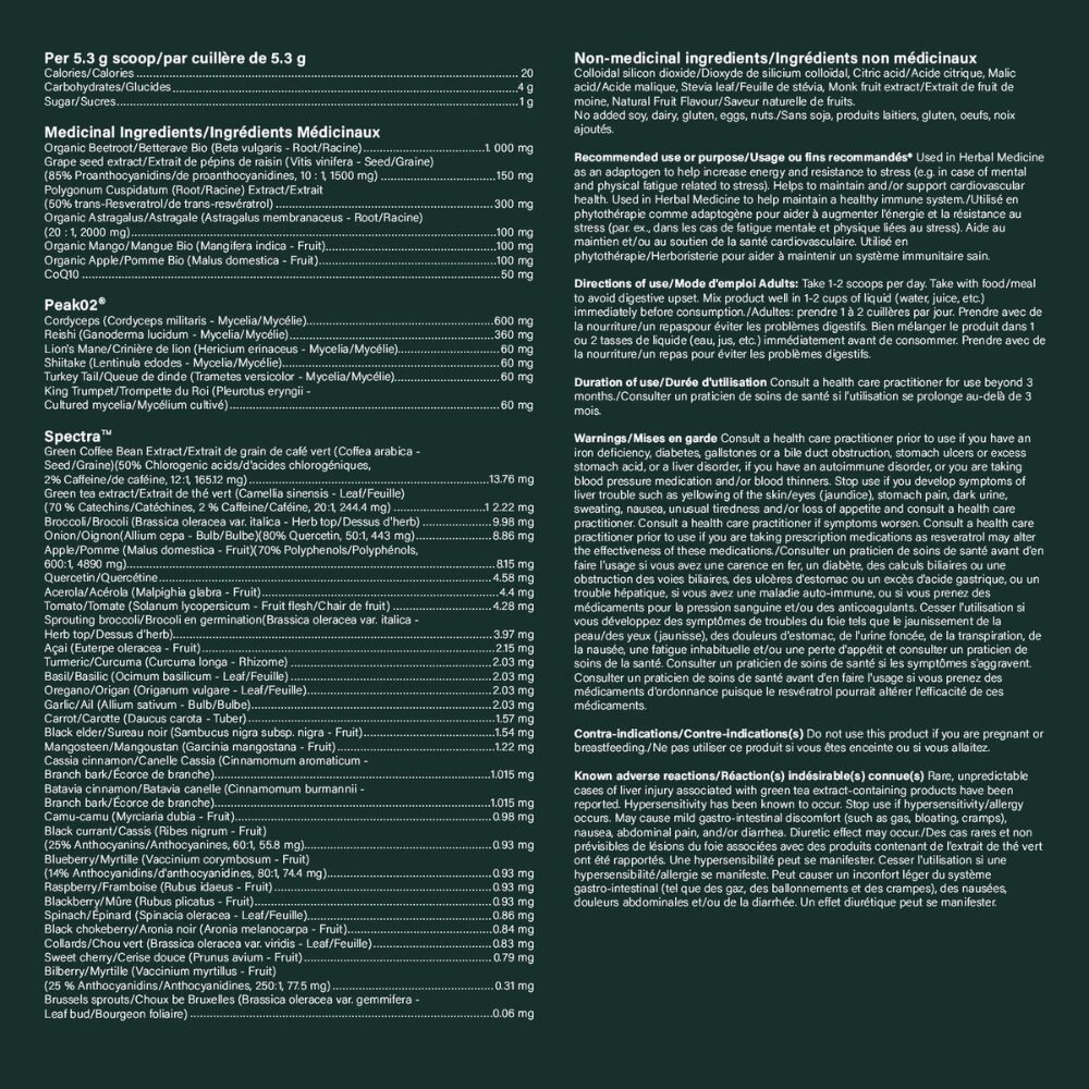 - Resveratrol, CoQ10, mango extract, and apple extract enhance mitochondrial energy production for increased energy without jitters.