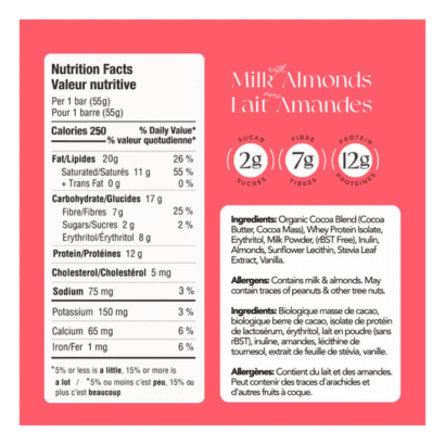 Organic Cocoa Blend (Cocoa Butter, Cocoa Mass), Almonds, Whey Protein Isolate, Erythritol, Milk Powder, (rBST Free), Inulin, Sunflower Lecithin, Stevia Leaf Extract, Vanilla