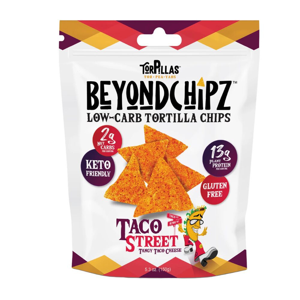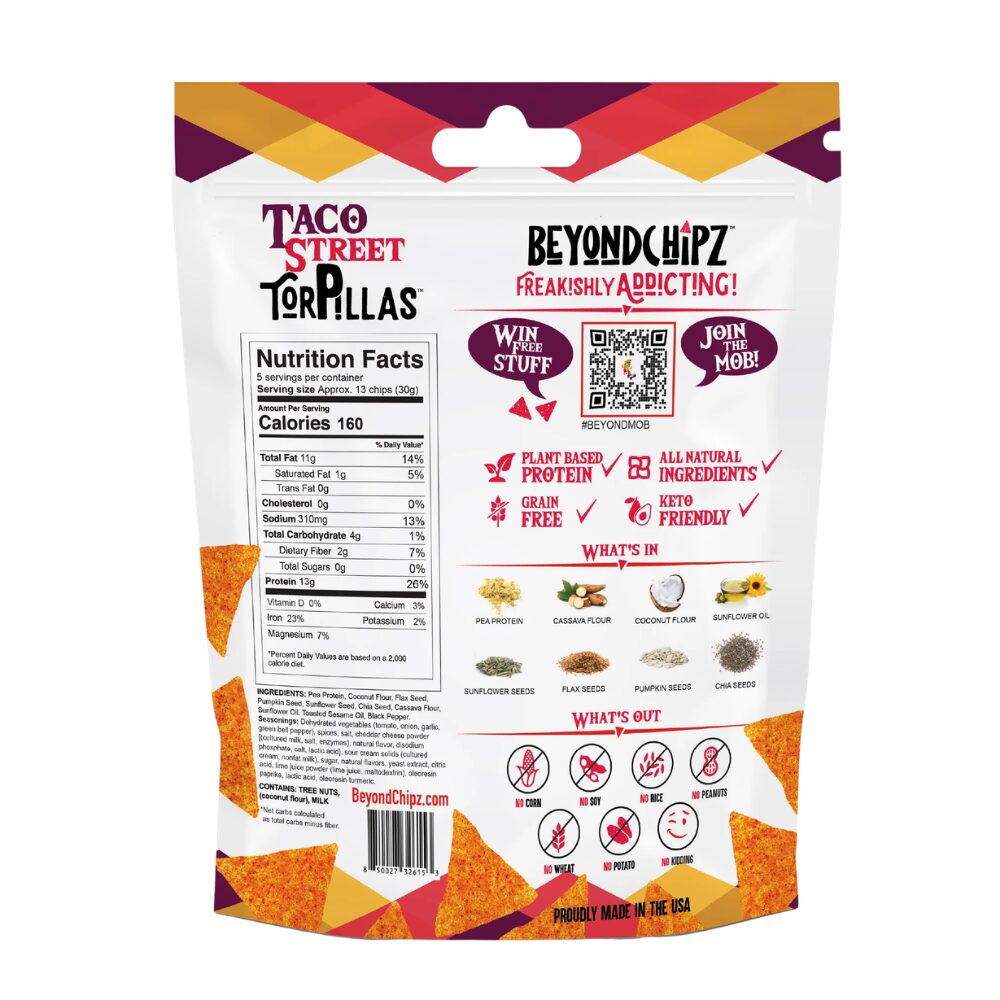 Everything you could ever want from a taco without the mess! BeyondChipz Taco Street meets all the requirements. Delicious, flavourful, and low-carb. What’s not to love? These grain-free chips are an addicting snack that you won’t have to rationalize eating all the time. Share with friends and see why we can’t stop obsessing over them (or eating them)! Made with wholesome ingredients like pea protein, seeds, and coconut flour, these gluten-free chips put the yum in yummy.