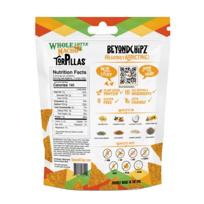 Chip away at BeyondChipz Whole Lotta’ Nacho chips. These are no ordinary chips! The chips are filled with plant-based protein and all-natural super ingredients. Want more? Don’t worry there’s more! These chips are also gluten-free, grain-free and keto-friendly. It’s all the fun of nachos without any soy, peanuts, wheat, corn or rice. It’s chips the way they should be, yummy and guilt-free!