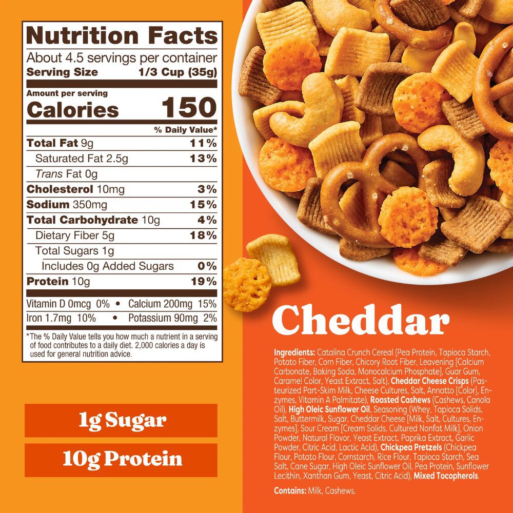 This mix of cashews, chickpea pretzels, cheese crisps and our signature cereal with a smooth, mild cheddar flavor.