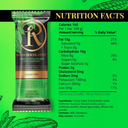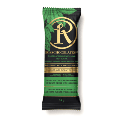 Our rich, chocolatey, dark stevia-sweetened chocolate infused with hazelnuts to give it a full-bodied flavour only nuts can provide, without the worry of increasing your blood sugars.