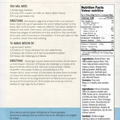 Almond Flour, Farm Girl Sugar Replacer, (Non GMO Soluble Tapioca Fiber, Enythritol,Inulin, Stevia), Flax Meal, Faba Protein Concentrate, Poppy Seeds, Orange Fiber, Baking Powder, Baking Soda, Isomaltulose, Cellulose Gum, Xanthan Gum, Tapioca Starch, Sea Salt, Natural Flavor.