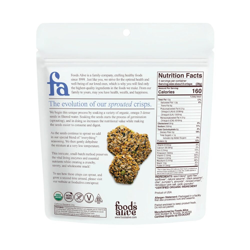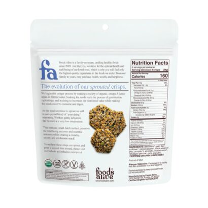 Why eat foods alive Sprouted Crisps? Well besides the delicious flavor and satisfying crunch, this wholesome snack is packed full of vitamins and minerals. Our crisps are comprised of a variety of seeds, that when sprouted provide optimal nutrition and a good source of essential fatty acids. Easy to digest, these crisps are a great snacking source for all preferred diets.