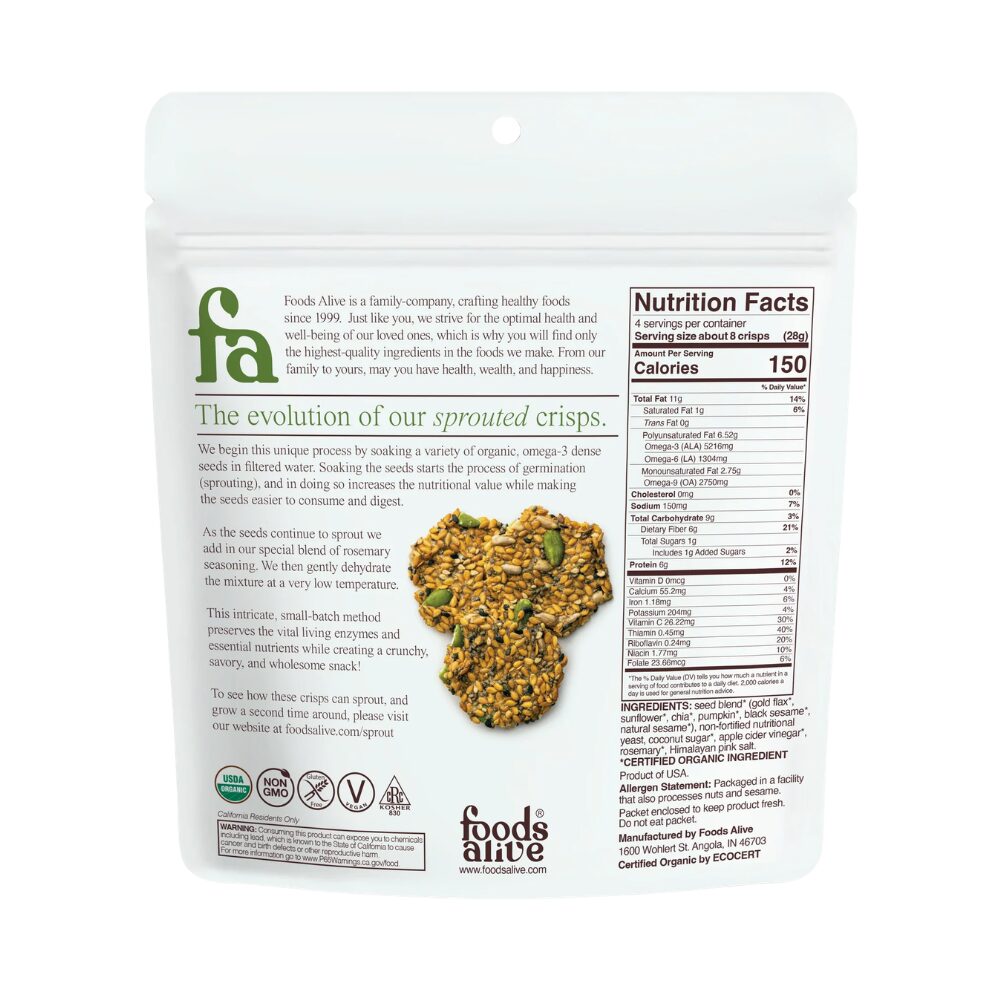 Why eat foods alive Sprouted Crisps? Well besides the delicious flavor and satisfying crunch, this wholesome snack is packed full of vitamins and minerals. Our crisps are comprised of a variety of seeds, that when sprouted provide optimal nutrition and a good source of essential fatty acids. Easy to digest, these crisps are a great snacking source for all preferred diets.