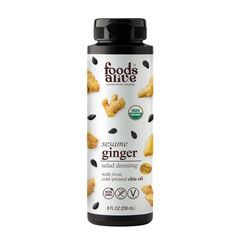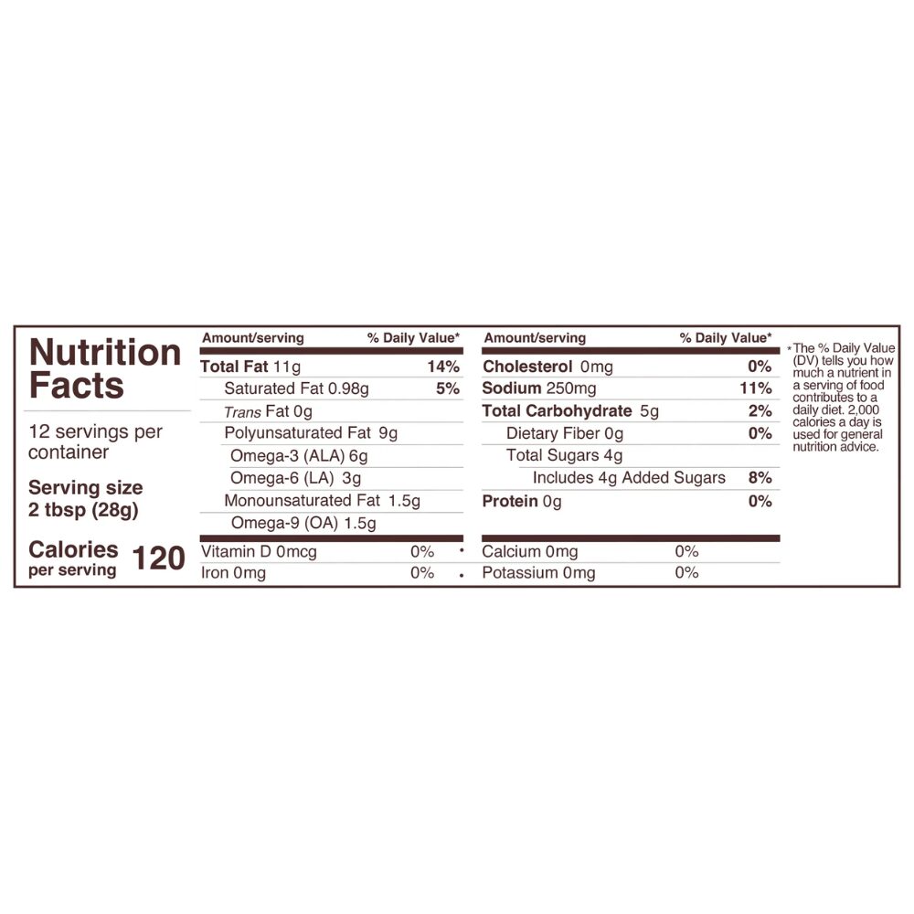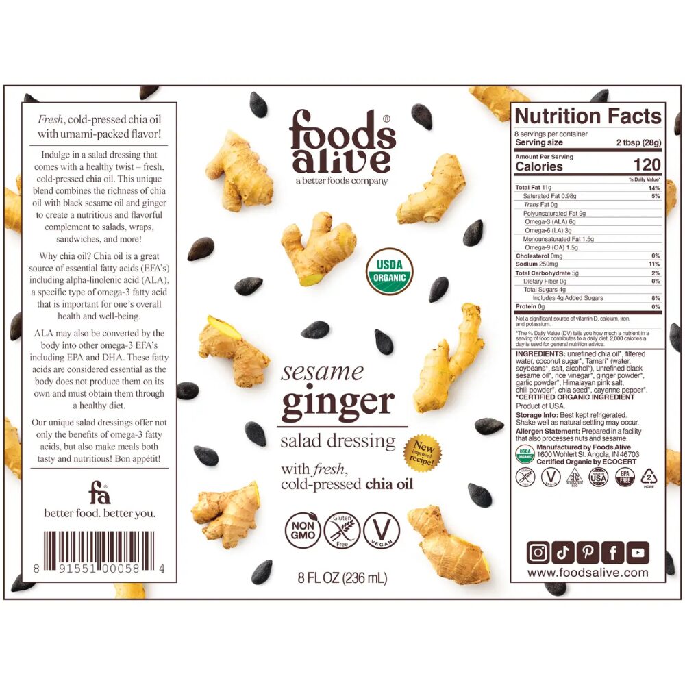 Ingredients: Unrefined chia oil*, filtered water, coconut sugar*, Tamari* (water, soybeans*, salt, alcohol*), unrefined black sesame oil*, rice vinegar*, ginger powder*, garlic powder*, Himalayan pink salt, chili powder*, chia seed*, cayenne pepper*. *Organic Ingredient.