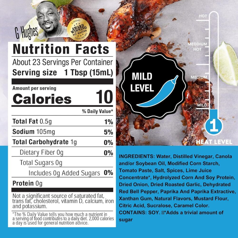Ingredients:Â Water, Distilled Vinegar, Canola and/or Soybean Oil, Modified Corn Starch, Tomato Paste, Salt, Spices, Lime Juice Concentrate*, Hydrolyzed Corn and Soy Protein, Dried Onion, Dried Roasted Garlic, Dehydrated Red Bell Pepper, Paprika and Paprika Extractive, Xanthan Gum, Natural Flavors, Mustard Flour, Citric Acid, Sucralose, Caramel Color.
