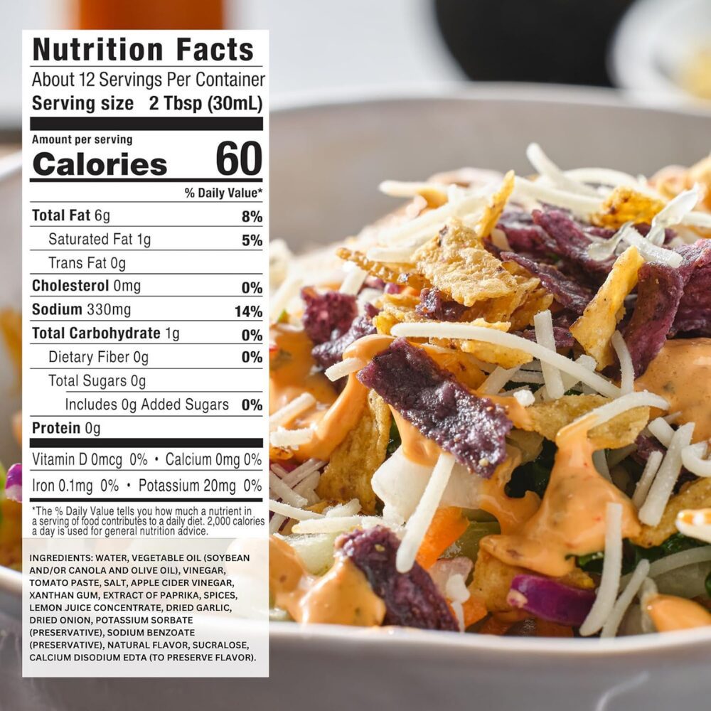 Ingredients: Water, Vinegar, Vegetable Oil (Soybean and/or Canola and Olive Oil), Tomato Paste, Salt, Apple Cider Vinegar, Xanthan Gum, Spices, Lemon Juice Concentrate, Extract of Paprika, Dried Garlic, Dried Onion, Potassium Sorbate (Preservative), Sodium Benzoate (Preservative), Natural Flavor, Sucralose, Calcium Disodium EDTA (to preserve flavor).