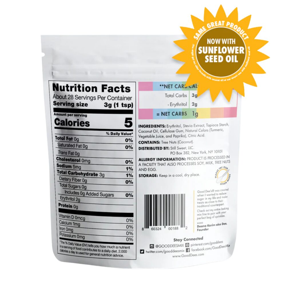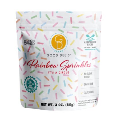 Good Dee’s Rainbow Sprinkles are 1g net carbs per serving, made with erythritol and completely sugar free. Our sprinkles are free of toxic dyes and chemicals and colored with natural colorings.