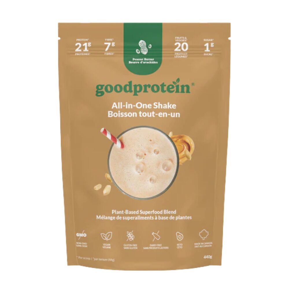Ingredients: Protein blend (pea protein, milled golden flaxseed), Natural flavours, Soluble tapioca fibers, Peanut flour, Coconut milk powder* (coconut milk powder*, tapioca maltodextrin*, acacia gum*), Acacia gum, Guar gum, Xanthan gum, Medium chain triglycerides (medium chain triglycerides from coconut oil, acacia gum), Salt, Fruits, vegetables and mushrooms blend (broccoli, spinach, kale, pumpkin, sweet potato, sunflower seed, cranberry, chlorella, maitake mushroom, shiitake mushroom, pomegranate juice powder*, acai juice powder*, goji juice powder*, grape juice powder*, amla fruit powder*, aronia powder*, sea buckthorn juice powder*, camu camu powder*, acerola juice powder*), Rebaudioside M, Bacterial culture and enzymes blend (rice maltodextrin, Bacillus subtilis, amylase, protease). *Organic ingredients