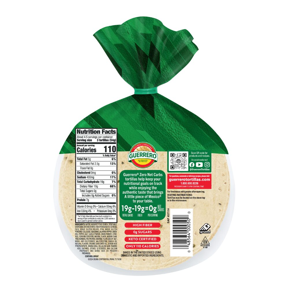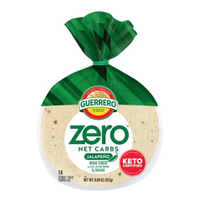 With carbs out of the way, your goals can be that much closer! Guerrero Zero Net Carbs Jalapeno Tortillas have zero net carbs, zero sugar, and all the flavor you’ll need to get where you want to be. This keto-certified tortilla makes tacos, quesadillas and more a better-for-you possibility.