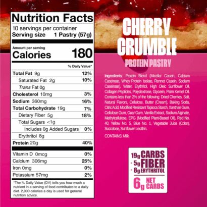 Built for performance with dessert-level satisfaction: 20g protein to keep you satisfied, 6g carbs to stay on track, and less than 1g sugar. It’s your anytime treat—breakfast, pre-workout, afternoon pick-me-up, or late-night sweet tooth. Big cherry-crumble taste. Zero compromise.