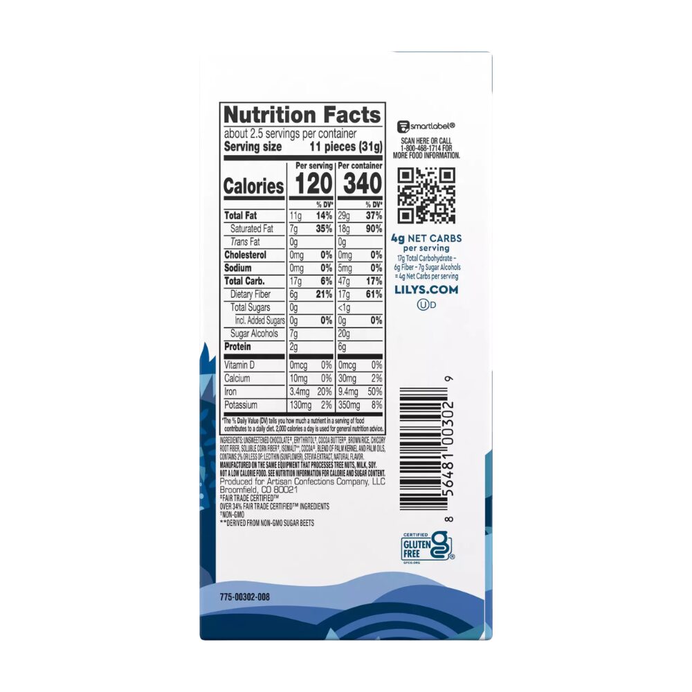 Ingredients: Unsweetened Chocolate, Erythritol, Cocoa Butter, Brown Rice, Chicory Root Fiber, Soluble Corn Fiber, Isomalt, Cocoa, Blend Of Palm Kernel And Palm Oils, Contains 2% or less of: Lecithin (Sunflower), Stevia Extract, Natural Flavor.
