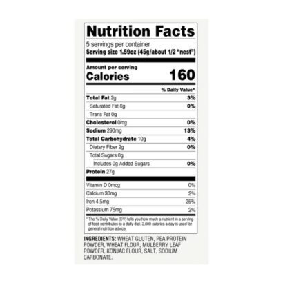 Ingredients:Â Wheat Gluten, Pea Protein Powder, Wheat Flour, Mulberry Leaf Powder, Konjac Flour, Salt, Water, Sodium Carbonate.