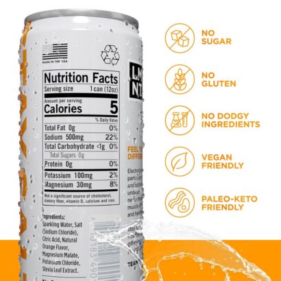 Ingredients: Sparkling Water, Salt (Sodium Chloride), Citric Acid, Natural Orange Flavor, Magnesium Malate, Potassium Chloride, Stevia Leaf Extract.
