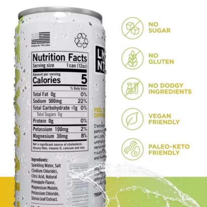 Ingredients: Sparkling Water, Salt (Sodium Chloride), Citric Acid, Natural Pineapple Flavor, Magnesium Malate, Potassium Chloride, Stevia Leaf Extract.
