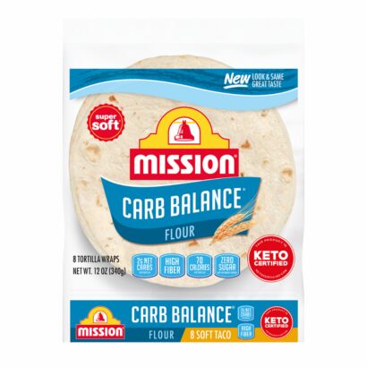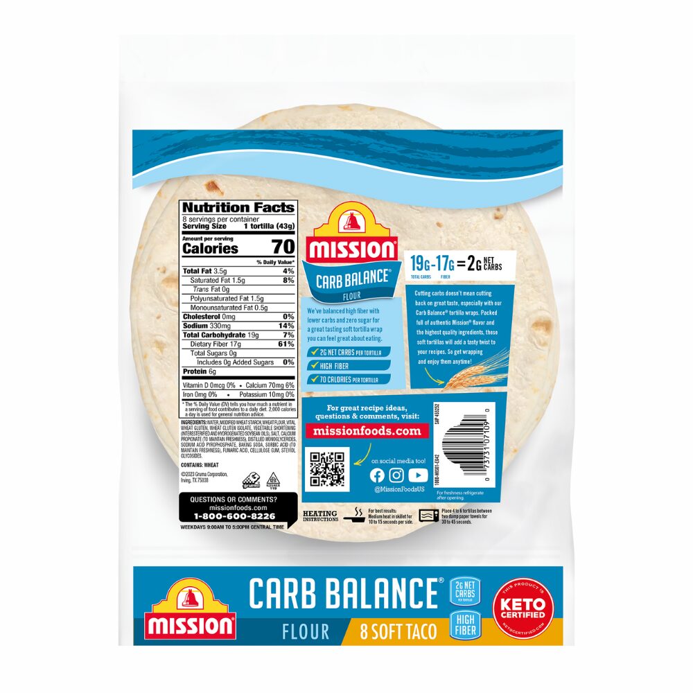 Mission Carb Balance Soft Taco Flour Tortillas have the super-soft texture and great taste you crave, but without all the carbs you don’t. You can feel good about treating your friends and family to our tortillas because they contain only 2g of net carbohydrates and zero sugar per serving. Our flour tortillas are also an excellent source of dietary fiber, and they don’t contain any trans fat or cholesterol. Versatile enough to use in all of your favorite low carb recipes, our tortillas help you feel balanced to the extreme. We recommend filling them with seasoned chicken breast, avocado, and ranch-spiced yogurt for a quick and delicious dinner. Includes one 8-count package of Mission Carb Balance Soft Taco Flour Tortillas.