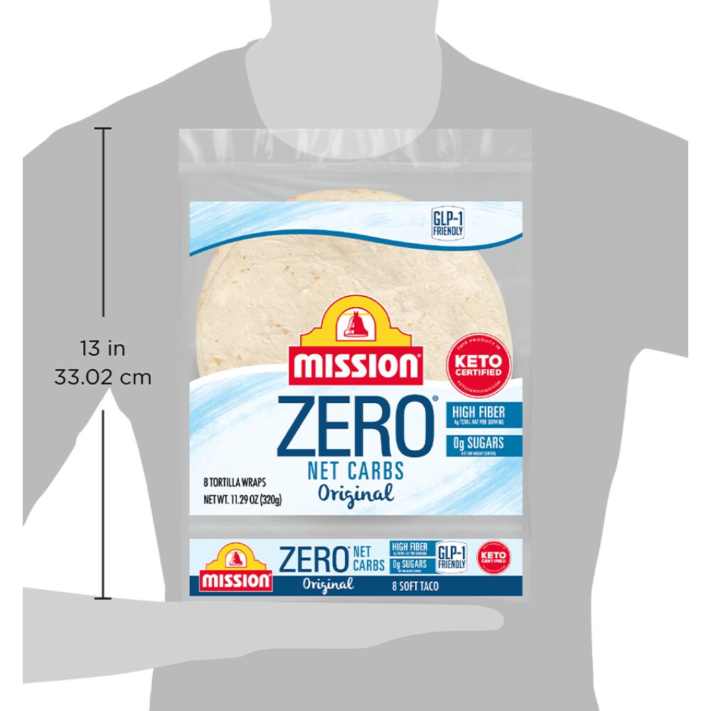 New Mission Zero Net Carbs Soft Taco Tortillas have the super soft texture and great taste you want in a tortilla, but without all of the carbs you don’t. Now in a larger size. You can feel good about using our tortillas in any of your homemade recipes because they contain 0g of net carbs and zero sugar per serving. Our zero net carb tortillas are also keto certified. Versatile enough for any low carb recipe, our tortillas help you feel balanced to the extreme. Try our tortillas filled with sliced turkey, sharp cheddar, and apple-arugula salad for an easy dinner everyone will love. Includes one 8ct package of Mission Zero Net Original Tortillas.
