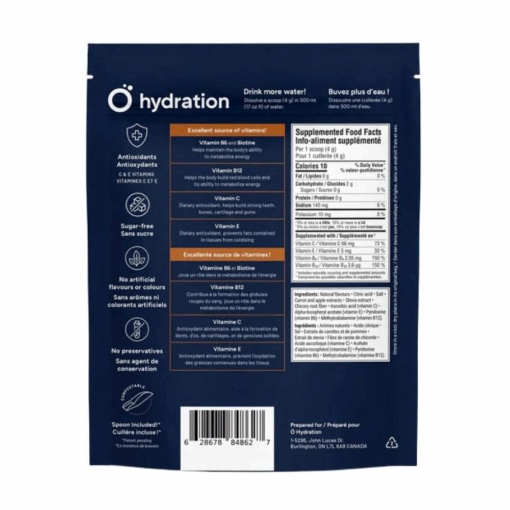 Ingredients: Natural flavours, Citric acid, Salt, Carrot and apple extracts, Stevia extract, Chicory root fiber, Ascorbic acid (vitamin C), Alpha-tocopheryl acetate (vitamin E), Pyridoxine (vitamin B6), Methylcobalamine (vitamin B12)