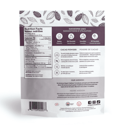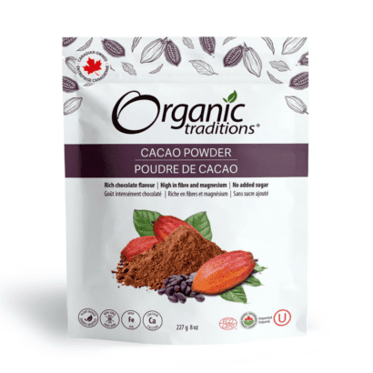 A true superfood, Cacao is a good source of Magnesium, Iron and Zinc and a very high source of Fiber. Cacao also contains essential minerals and a host of antioxidants giving it an ORAC value of 11,000 per serving. While most cacao nibs are roasted, Organic Traditions cacao nibs are raw with no added flavors or additives. The nibs are then pressed into a paste and the cacao’s fat content is removed, yielding delicious Cacao powder. While many other Cacao Powders have added sugar, Organic Traditions is pure, rich Cacao Powder in its natural state with no added flavorings or sweeteners. Use Organic Traditions Cacao Powder in smoothies, desserts, on top of yogurt, berries, for baking or in any other recipe.
