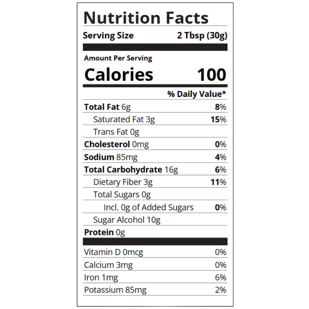 Ingredients: Maltitol Syrup, Palm Oil, Water, Polydextrose, Sorbitol, Maltodextrin, Isomalt, Cocoa Processed With Alkali, Canola Oil, Cellulose, Contains 2% Or Less Of: Mono- and Diglycerides, Salt, Sodium Acid Pyrophosphate, Citrus Fiber, Polysorbate 60, Natural and Artificial Flavors, Potassium Sorbate (Preservative), Soy Lecithin, Sucralose (Non Nutritive Sweetener), Citric Acid, Guar Gum, Artificial Color (Including Red 40, Yellow 5 And Blue 1), Antioxidants (Ascorbyl Palmitate, Mixed Tocopherols, Chamomile and Rosemary Extracts).