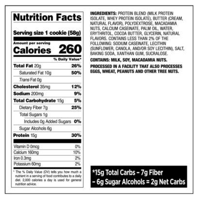 Ingredients: Protein blend (milk protein isolate, whey protein isolate), butter (cream, natural flavor), polydextrose, macadamia nuts, calcium caseinate, palm oil, water, erythritol, cocoa butter, glycerin, natural flavors. Contains less than 2% of the following: sodium caseinate, lecithin (sunflower, canola, and/or soy lecithin), salt, baking soda, xanthan gum, sucralose.