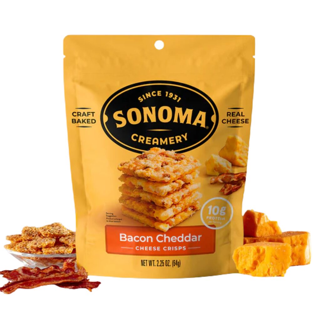 Sonoma Creamery Bacon Cheddar Cheese Crisps are baked, never fried Crunchy Real Cheese Snacks. We take rBST-Free (free of artificial hormones) Cheddar Cheese and Real Applewood Smoked Bacon and bake them with a sprinkling of certified gluten-free Organic Brown Rice and Oat Bran into thin, crunchy, bacony, cheesy crisps. Our Bacon Cheddar Cheese Crisps provide a gluten-free, low carb alternative to your morning routine or afternoon snack. Packed with flavor and oh so snackable, our Bacon Cheddar Cheese Crisps are sure to be a crowd pleaser!