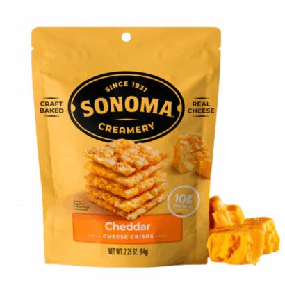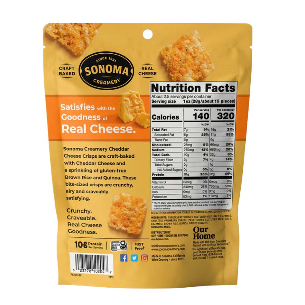Sonoma Creamery produces crunchy, craveable, craft-baked snacks using high quality ingredients like real cheese and gluten-free whole grains, that can be enjoyed without compromises so you can snack freely. Sonoma Creamery Cheddar Cheese Crisps are baked, never fried crunchy Real Cheese Snacks. We use rBST-Free Cheddar Cheese made with milk completely free of artificial hormones. Our Crisps provide a gluten-free, low carb alternative to your morning routine or afternoon snack. Packed with flavor and oh so snackable, our Cheddar Cheese Crisps are sure to be a crowd pleaser.