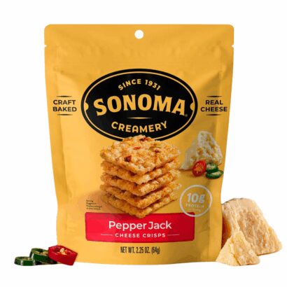 Sonoma Creamery Pepper Jack Cheese Crisps are baked, never fried crunchy Real Cheese Snacks. Based on our famous Sonoma Hot Pepper Jack recipe, we bake in 10-Month Aged Parmesan and a sprinkling of gluten free grains. Each bite delivers a delightful crunch with a mild kick of heat. Packed with flavor and oh so snackable, our Pepper Jack Cheese Crisps are sure to be a crowd pleaser.