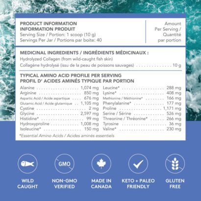 Our premium wild-caught marine collagen is sourced from North Atlantic fish and processed locally in Canada. It is tested to meet the world’s most stringent standards for heavy metals and toxins. Marine collagen comes from the parts of the fish (scales and skin) that would usually be discarded during processing. Marine collagen is a source of type I collagen. Type I is the most plentiful collagen in our bodies. It can be found in our skin, tendons, bones, teeth, ligaments and connective tissues. Collagen is often associated with skin health and rightly so! Type I collagen is the main component of our skin and is a key building block for maintaining its elasticity and firmness.