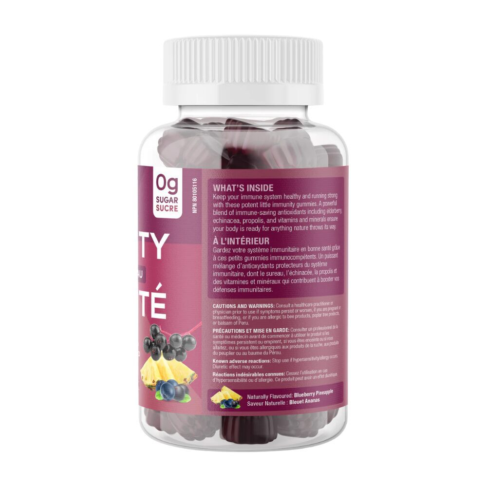 Non-medicinal Ingredients: Tapioca syrup, Water, Fruit flavour (Natural), Agar, Pectin, Citric acid, Sodium citrate dihydrate, Pea protein concentrate, Stevia leaf extract, Carnauba wax, Medium chain triglycerides.
